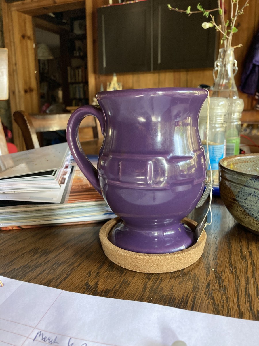 It is Saturday morning, and I am sitting at the kitchen table writing and Biscuit, the blanket stealing dog, is at my feet. I have my cup of tea with cream and a candle burning. The fire roars in the woodstove. There were coals left this morning, so it started easily. I watch the birds outside the window.