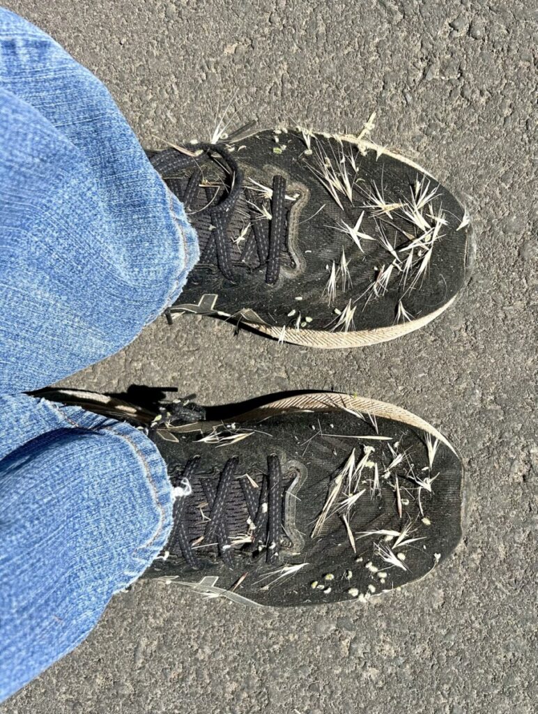 This is what my shoes looked like the other day after pulling just a few more weeds before the trash collectors came. Now you know why foxtails are at the top of my evil weed hierarchy? You can also see some of the evil Velcro burr weeds, too. They love to attach to my shoelaces.