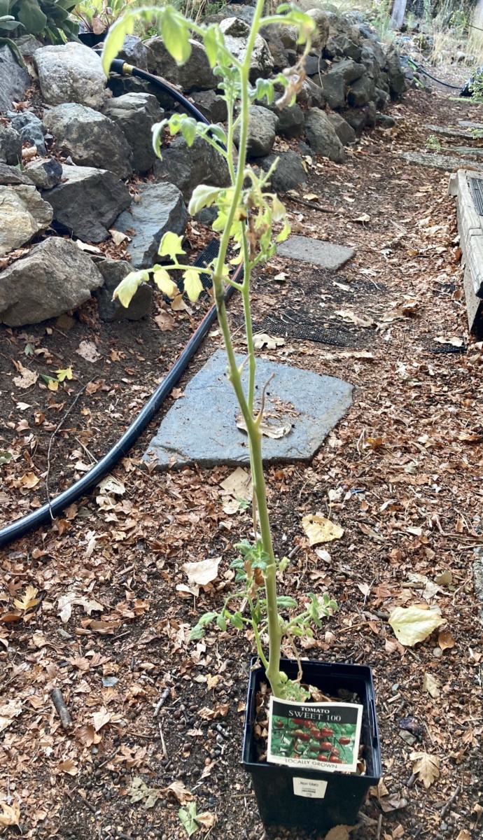 It is the “Sweet 100” tomato plant that I bought last spring and meant to put in my whiskey barrel planter, which is behind a little fence on the back deck. It was going to be part of my little summer garden. Somehow, I never got around to planting it. In spite of everything, this brave plant produced two delicious, perfect tomatoes for me and is blossoming still, even though it had to live out its life in a tiny pot in a shady part of the front yard and got munched by the deer at least once. I waited and waited for the right time to plant, and that time never came. Now it is too late. The time for a summer garden is gone.