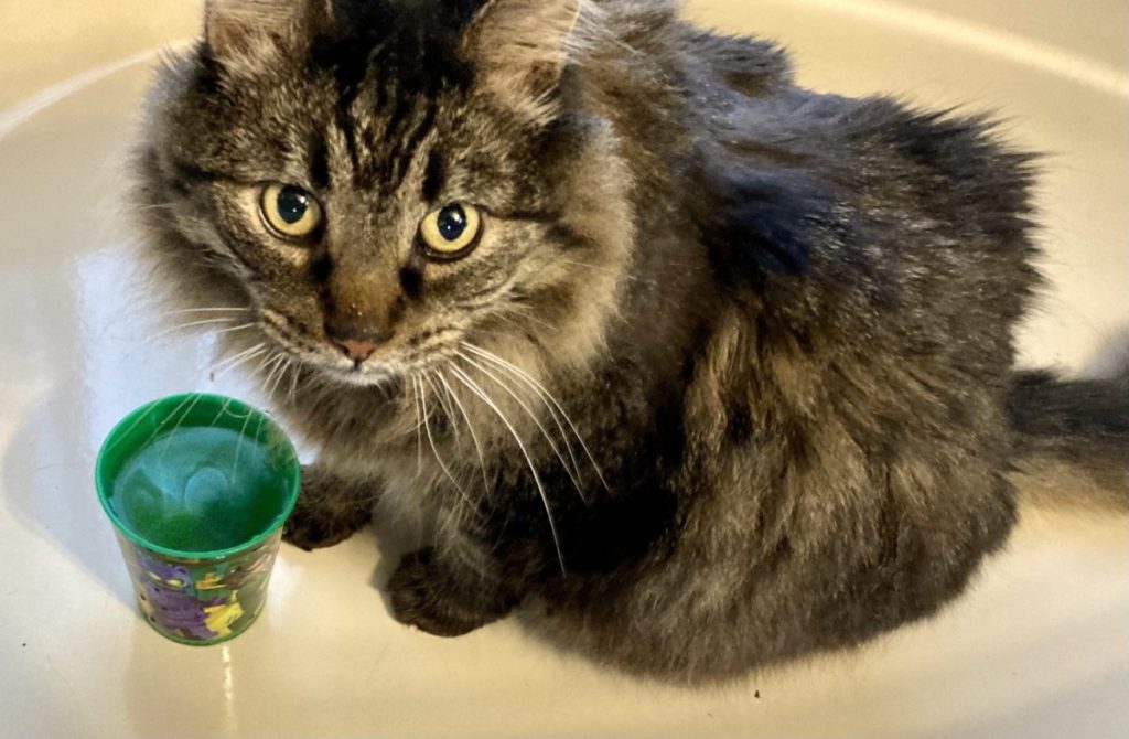 Also? If he has food, then he often complains until we fill up his water cup with fresh water. Don’t believe him for a second when he tells you he has no water. There is water for him all over the house. But he doesn’t like that water. He wants it to be fresh out of the tap.