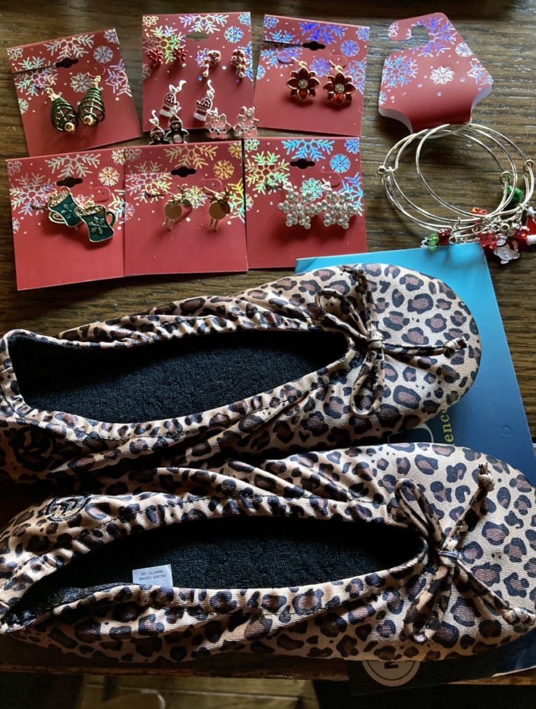 So you will understand that I was a little surprised when I opened the final Kohl’s package and found, not my underwear, not my unmentionables, but a pair of cheetah print Isotoner ballet slippers (size M), six pairs of dangly holiday earrings (Hot chocolate mugs! Rudolph! Snowflakes!) and an assortment of bangle bracelets with snowmen, a Santa hat, a candy cane, and stars).