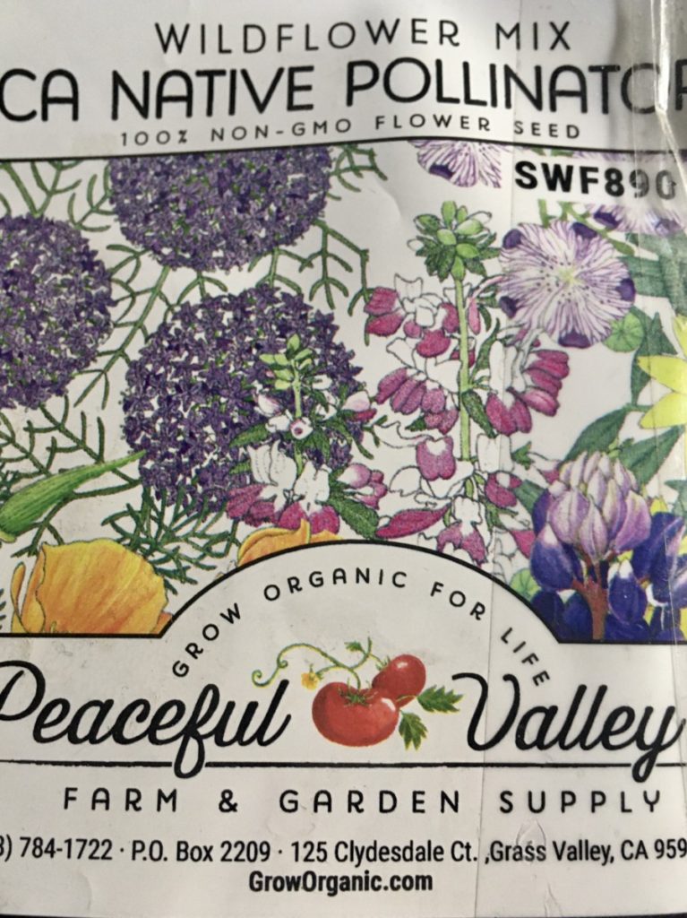 Today, I went outside and scattered seed again: more California poppies, more  lupine, baby blue eyes, globe gilia, California bluebells. I found sticks and pushed them into the earth, marking where the seeds fell. Next spring when green shoots emerge, if they emerge, if there is rain, I will remember that these are wildflowers, not weeds. At least some of them. Odds are good that there will be weeds, too. But after working this soil for a few years now, I think I can tell them apart. Mostly. At least the worst offenders: the ferny burr weeds, the yellow sticker clovers, the foxtail grasses that lodge in my dog’s feet and ears.